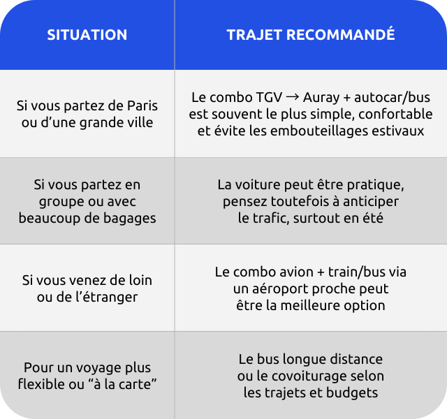Le combo TGV → Auray + autocar/bus est souvent le plus simple, confortable et évite les embouteillages estivaux